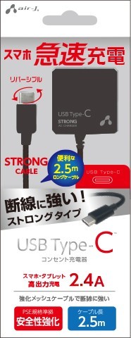 - USB Type-C対応/断線に強い高出力2.4A・AC充電器2.5m・AKJ-CTL24STG BK