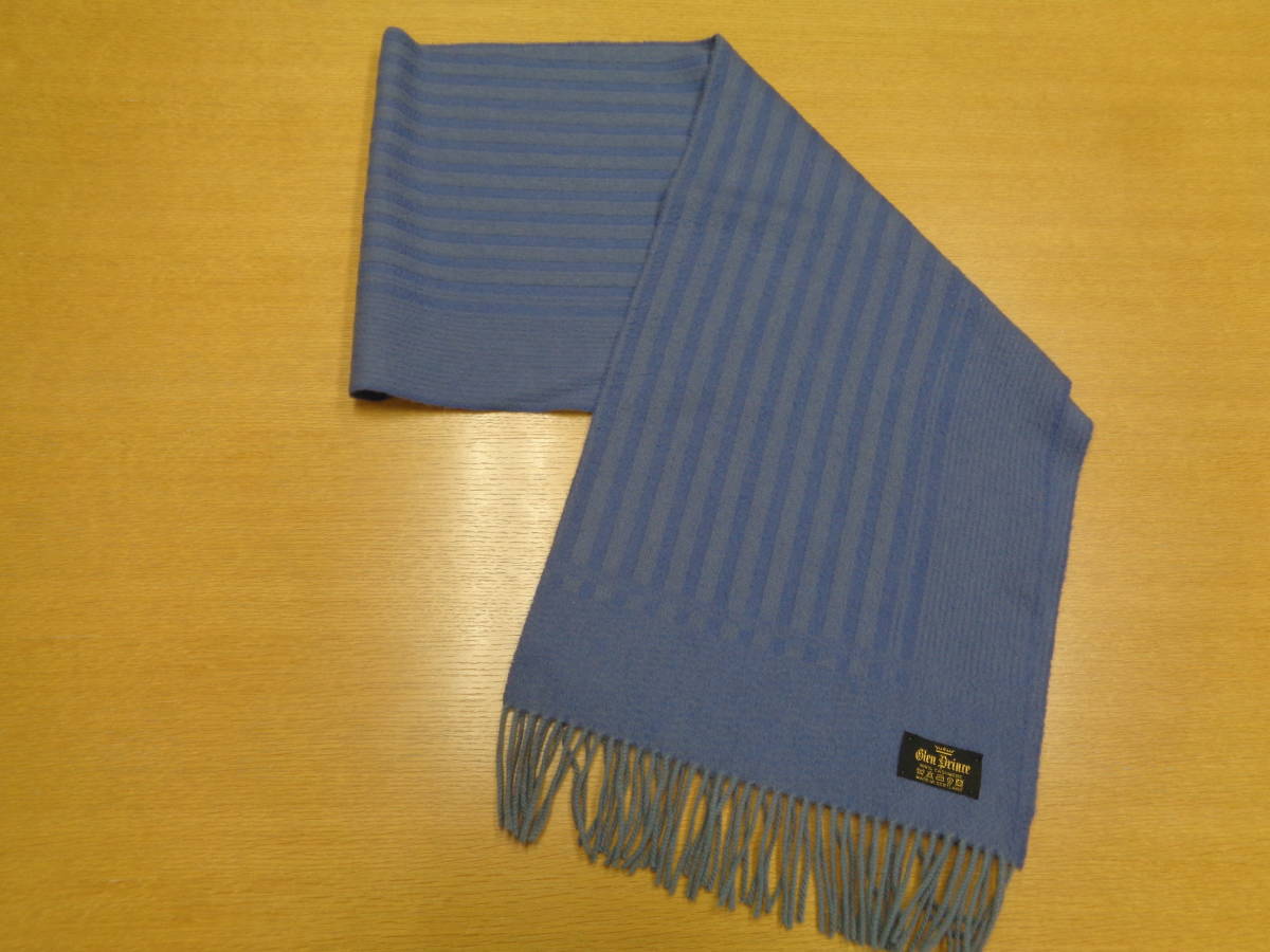 > 半額以下! 定価 ¥35,000 GLEN PRINCE グレンプリンス マフラー 長さ190cm 幅35cm フリンジ9cm カシミヤウール ストライプ柄 ブルー