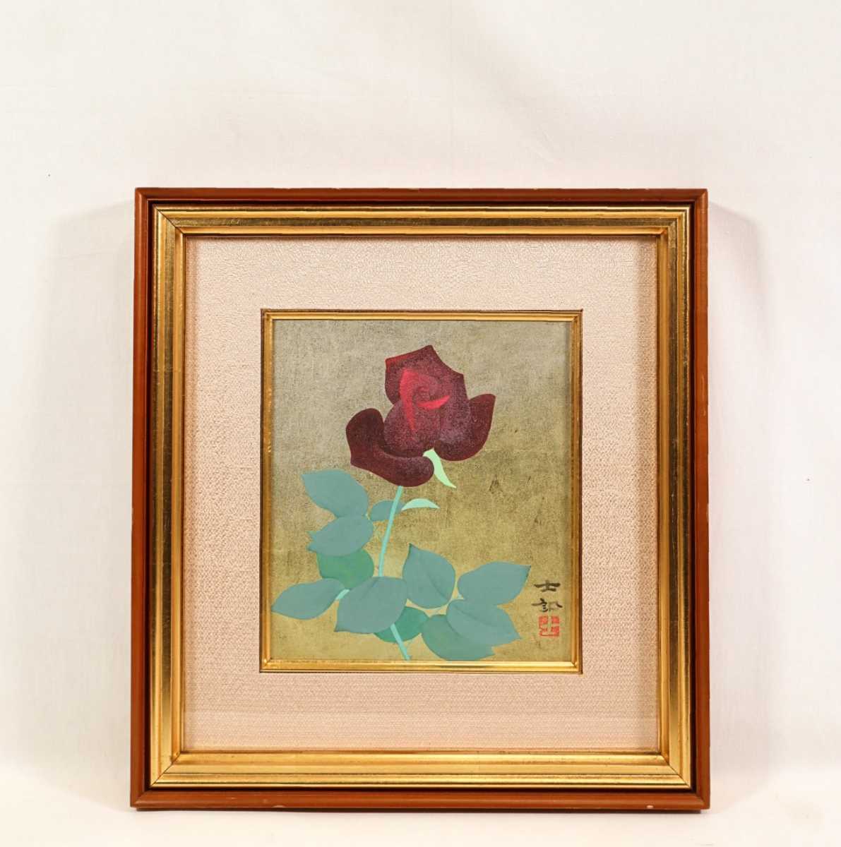 - 真紅 長縄士郎 日本画「ばら」画寸 24cm×27cm 岐阜県出身 日展参与 加藤栄三に師事 艶やかな深い真紅の花びらが印象的な薔薇の花 6735
