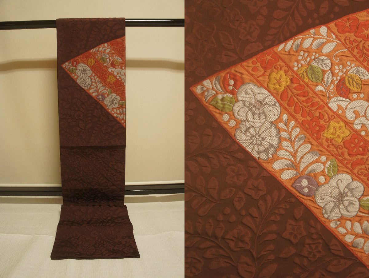 > 特選紫紘紅檜皮色地ふくれ織り辻ヶ花模様袋帯[O14141]