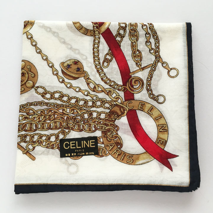 - セリーヌ / CELINE ハンカチ 赤リボン&金チェーン&土星形チャーム柄 透かし入り白生地【5654】