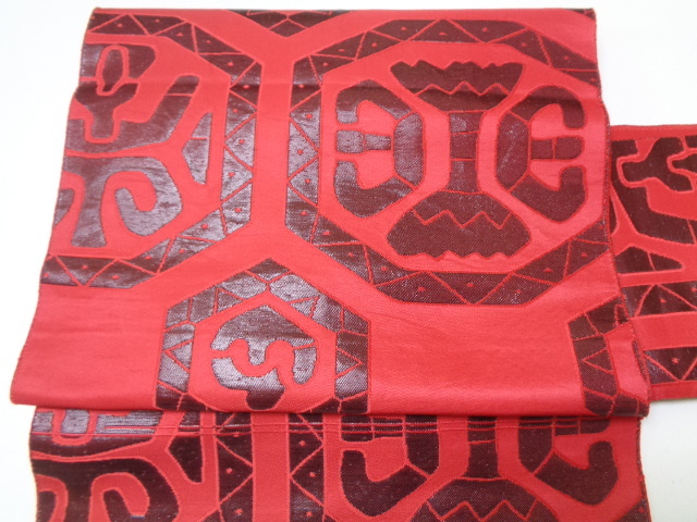 > b411-80 名古屋帯 正絹 亀甲に象形花文 松葉仕立て