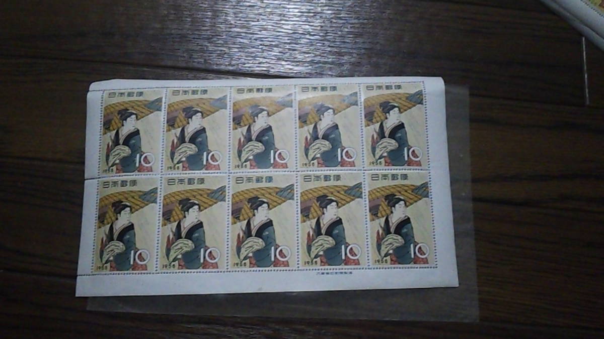 - ..未使用切手 1958 切手趣味週間 雨傘 10円シート 張り付きあり
