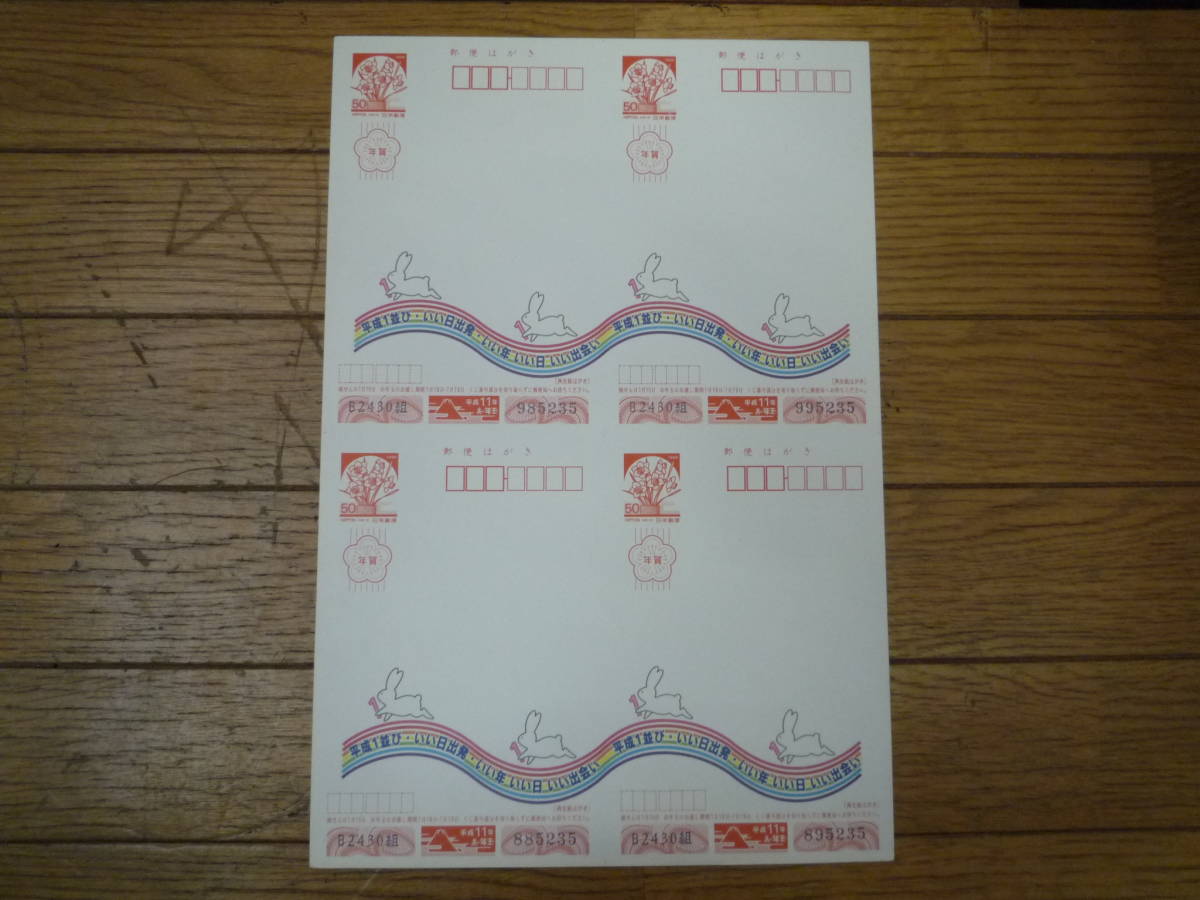 > ◆希少品 1シート4枚分 カット無し 平成11年 年賀状 額面200円 スタンプラリー◆平成1並び/いい日出発/いい年/いい日/いい出会い