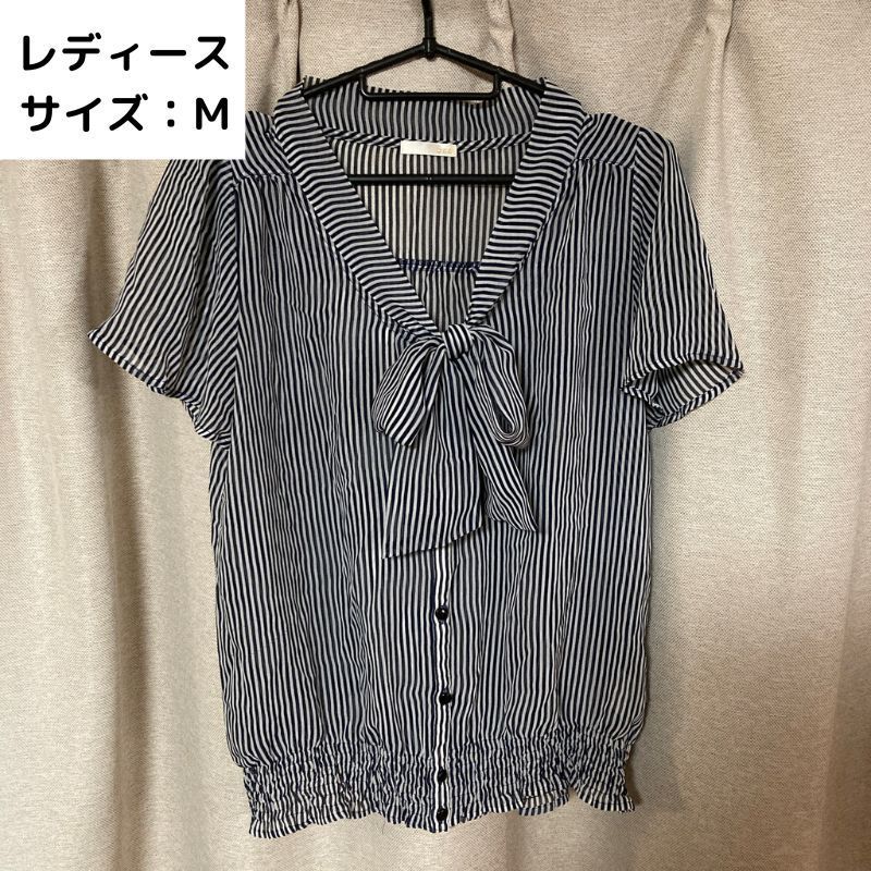 - ボウタイ ブラウス 半袖 ワールド CE2 セウウ ストライプ ネイビー サイズM トップス