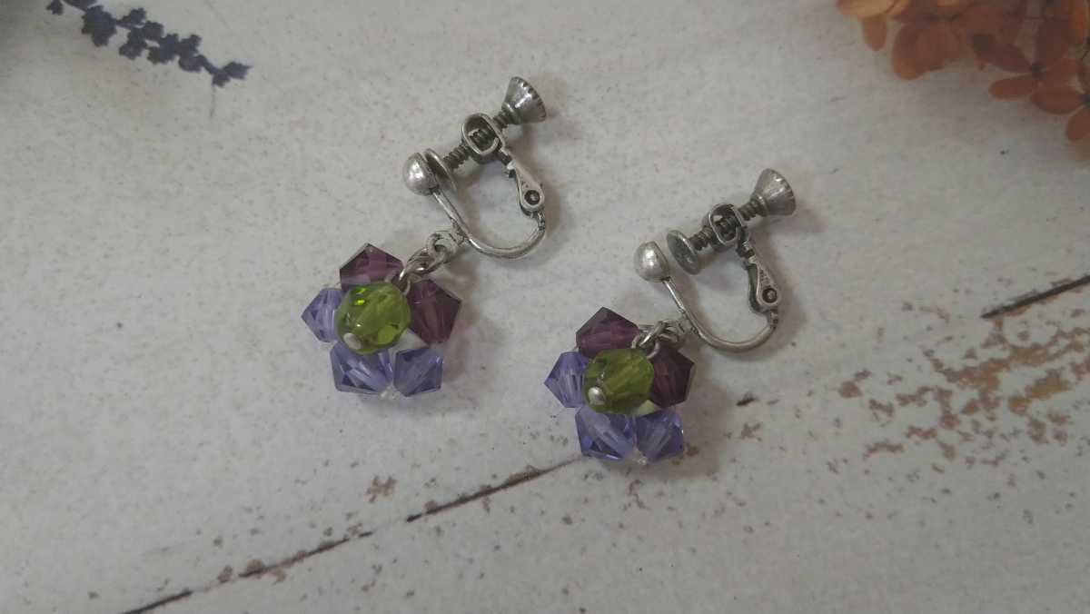 - □多面カットクリアブルー・パープル・黄緑ビーズ・フラワーイヤリング□