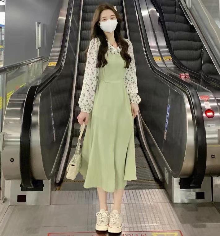 - 【グリーン★M】長袖 花柄ブラウス レイヤード風ワンピース