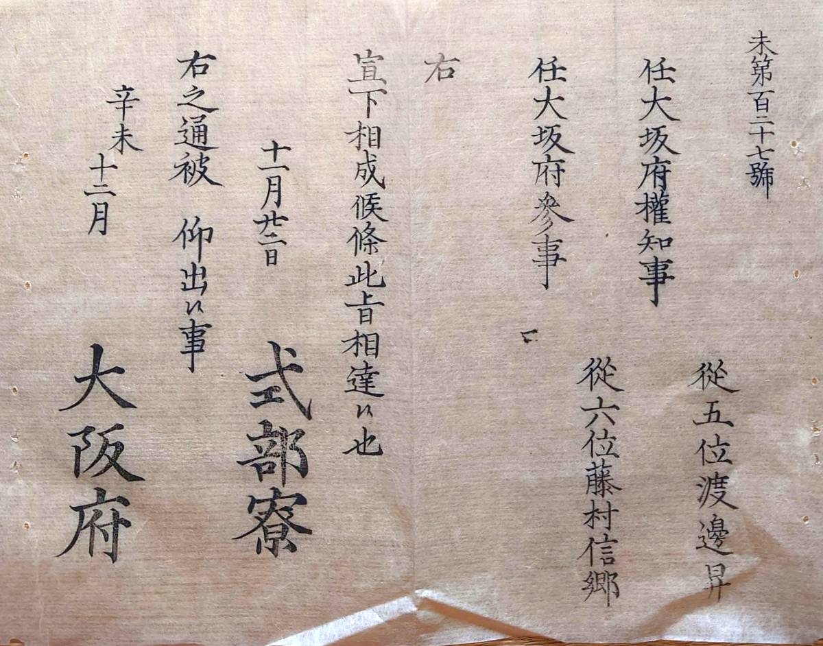 - f23022606〇明治布告布達 明治4年 任大阪府権知事 任大阪府参事 式部寮 大阪府〇和本古書古文書