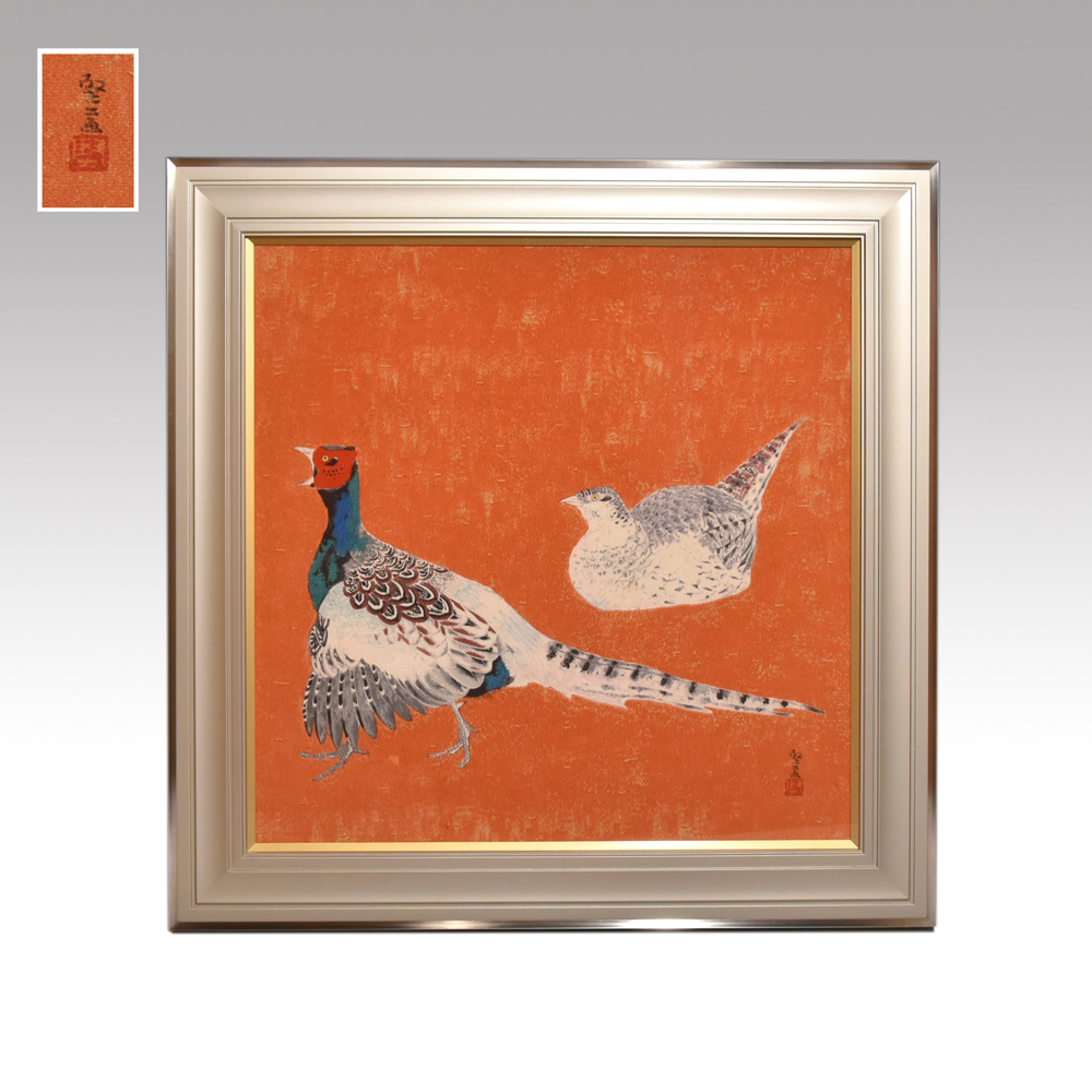 - 【模写】吉岡堅二 「番雉」風呂敷 額装 ふじみやび 絹100% 縮緬 風呂敷 絵画 書画 日本画 アート インテリア y1849