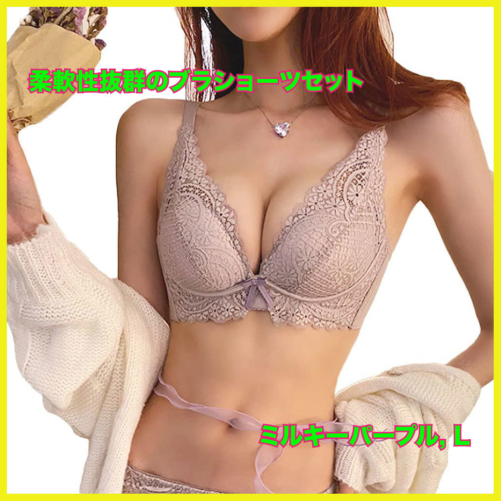 > ブラジャー ショーツセット 超盛りブラ・バストアップ美胸・脇高設計 ノンワイヤーブラ 補正ブラ (ミルキーパープル, L(A80,B80,C80対応))