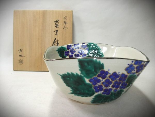 - 【睦】狐森窯「福森阿也」作 四方 菓子鉢 染付 紫陽花 茶道具 共箱■