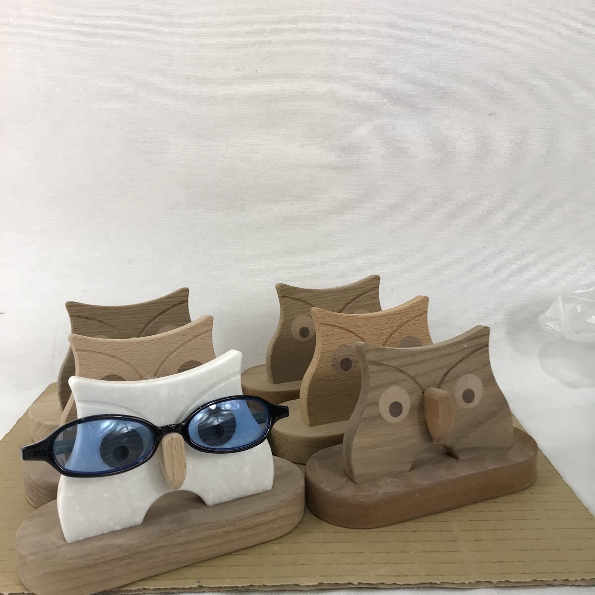 > k ⑦ フクロウのメガネ掛け 木製 ハンドメイド セット アンティーク 置物 自然素材