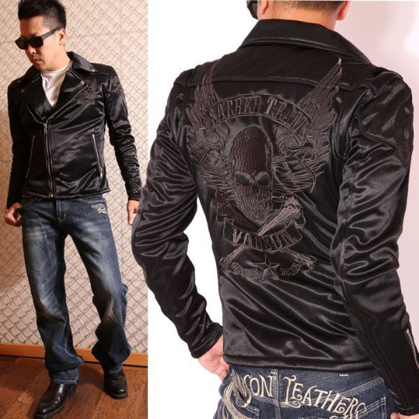 > 当店別注 バンソン VANSON ボンディング ダブルライダース ジャケット ACV-701 ブラック×チャコール刺繍【Sサイズ】刺繍 ドクロ スカル