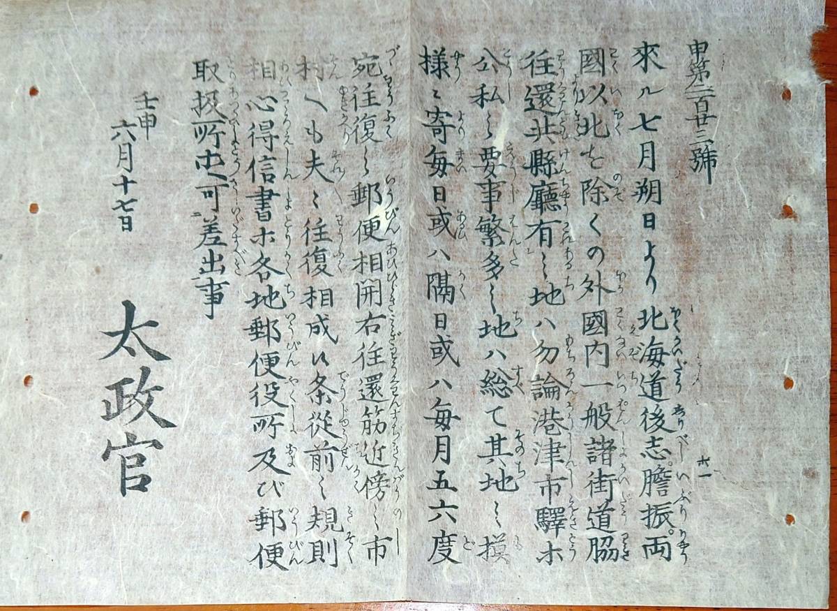 - f23032420〇明治布告 郵便毎日配達 県庁所在地 太政官 北海道を除く 明治5年 大阪府〇和本古書古文書