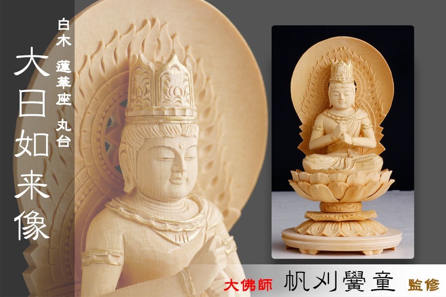 > 仏像 ■ 白木 1.5寸【金泥描き】大日如来像 蓮華座 丸台 ■ 真言宗 本尊大佛師【帆刈黌童】監修 手彫り 仏壇用 御本尊 木彫り