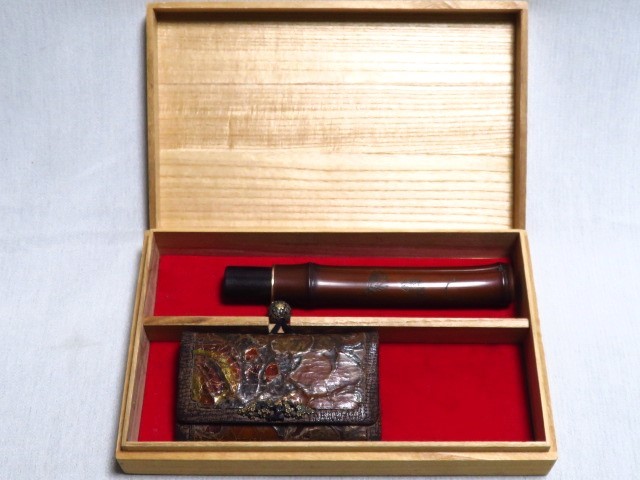 - 煙管筒 煙草入 在銘 緒締め 透かし 虫彫刻 時代提物 用心箱