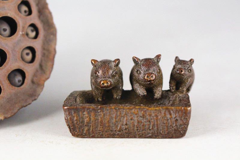 - 極美古銅煎茶道具 質感 細工実心実感 銅三頭の子豚食槽 置物 香器 可愛い 豬 心癒す