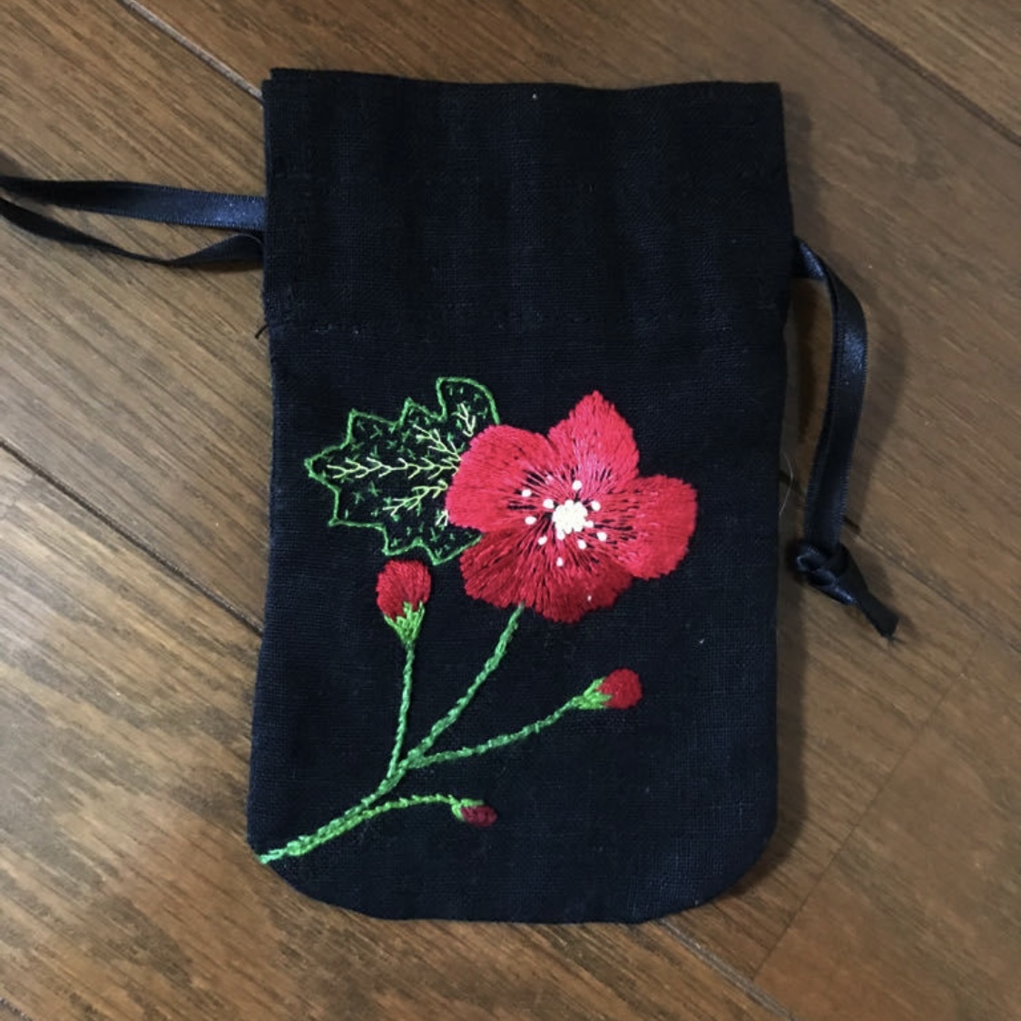 - ハンドメイド 刺繍 ポーチ 巾着 飴入れ 黒 つばき おおよそ縦14.5 横9