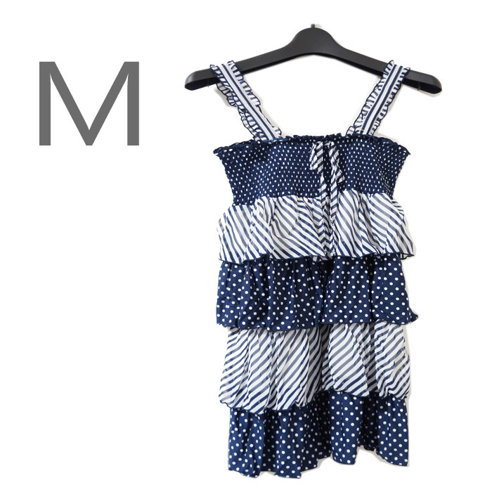 - ●新品/キャミソール/フリル/M/ネイビー系/ドット/ストライプ/レディース●f5901