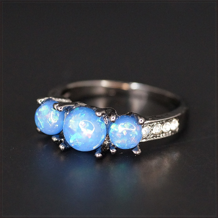 - [RING] スリー ラウンド ブルー ファイア オパール ストーン & ホワイト キュービックジルコニア ブラック ゴールド 7.5mm リング 12号