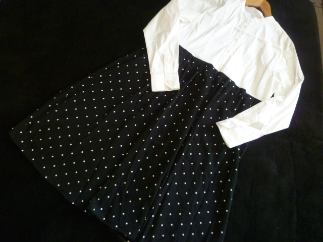 - UNIQLO/ユニクロ◇ノーカラーシャツ×ドット柄スカートドッキングワンピースXL/リメイク品ロング大きいサイズ◇OP629