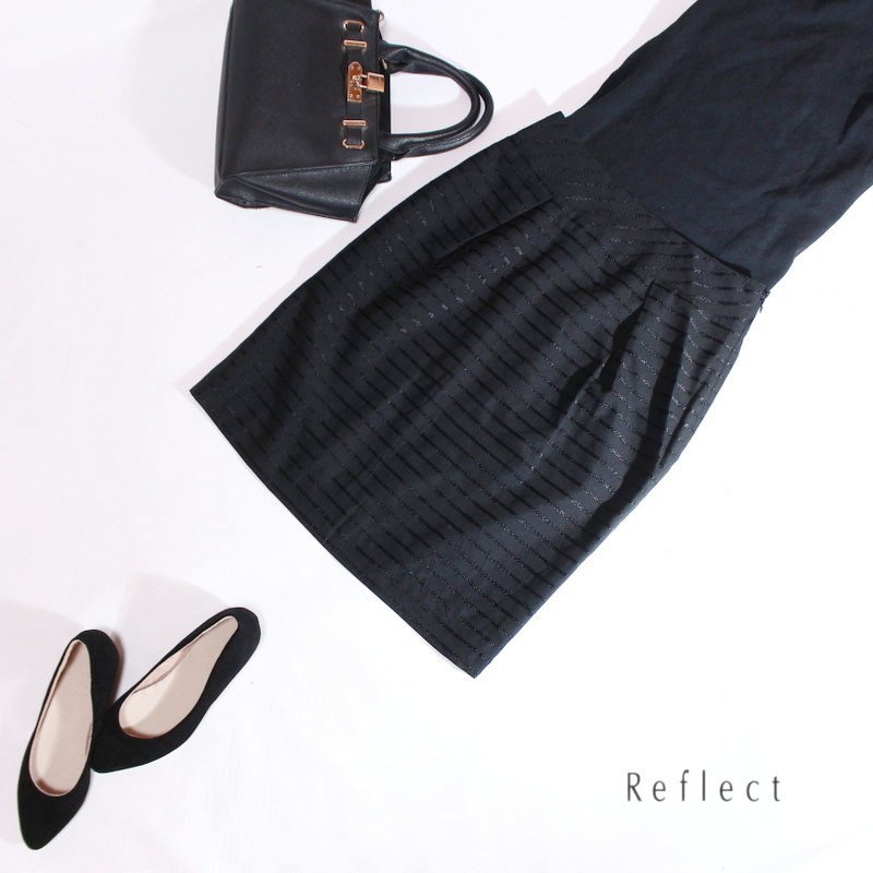 - 美品 リフレクト Reflect 株) ワールド ■ 春 夏 綺麗め 刺繍 ボーダー柄 タック フレアスカート 7号 ブラック 黒 フォーマル 綺麗め
