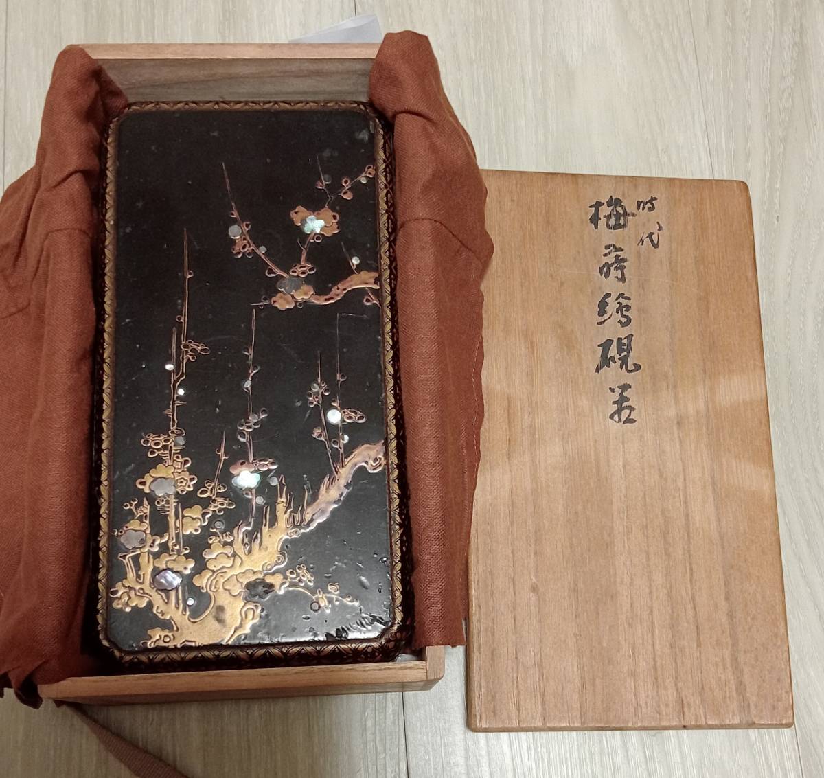 高蒔絵 螺鈿 梅絵書 硯箱 時代箱 文箱 古銅 水滴 共箱