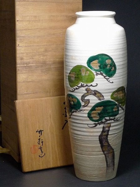 - ▲10G1277▲三浦竹軒造・光琳松図・花瓶/花入・花器・共箱付・茶道具