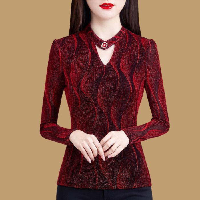 - 【レッド★L】ベルベット風 レディース Vネック 長袖 カットソー 飾りボタン付