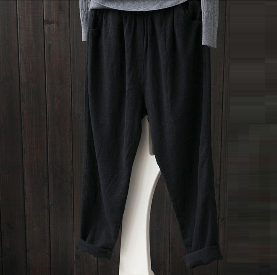 - 秋上品 カジュアルパンツ 綿麻リネン ウエストゴム ゆったり 無地 サルエルパンツ ワイドパンツ 黒