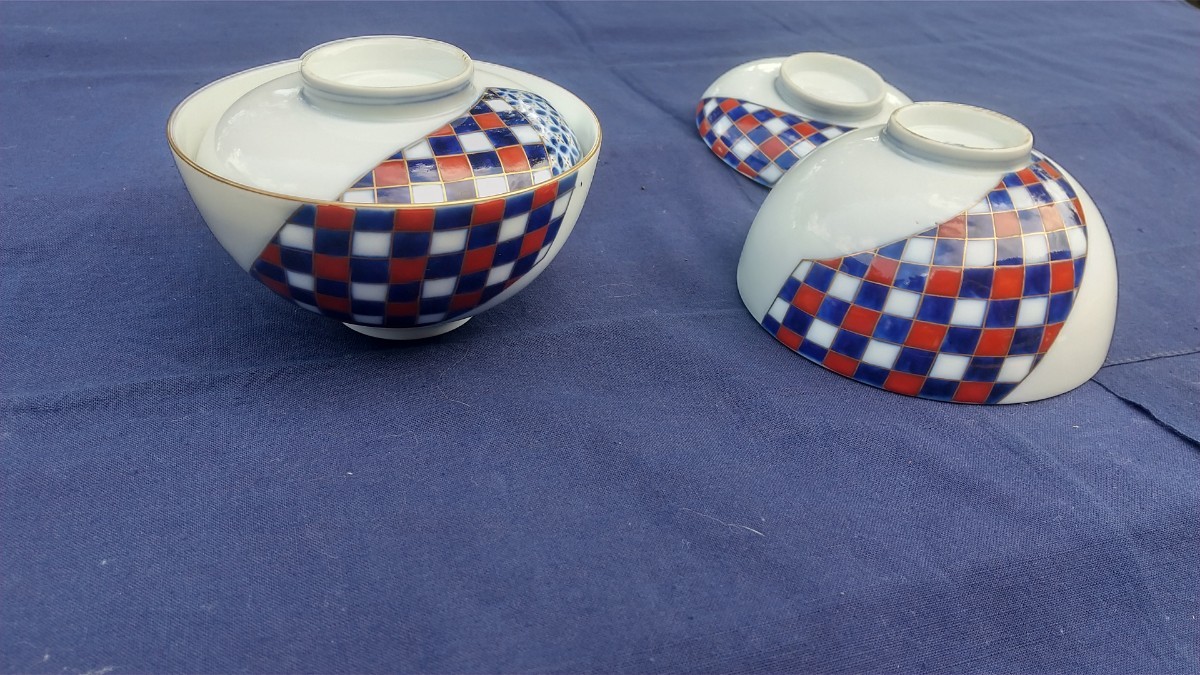 - 明治~大正期 香蘭社 蓋付き茶碗 市松と七宝の香蘭社調 オールド香蘭社