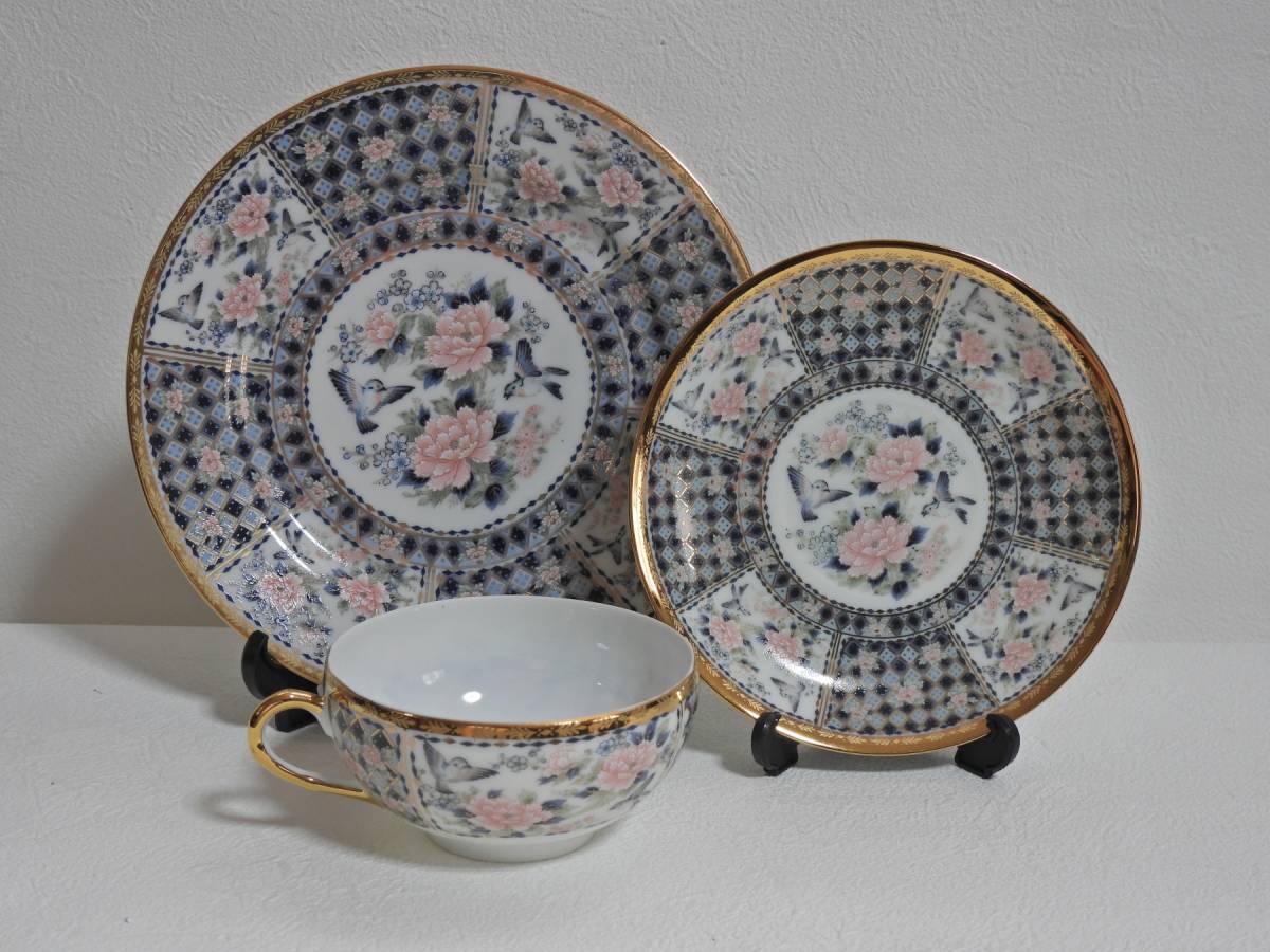 - 3 ピース カップ & ソーサー+サラダプレート・ ”ピンク牡丹” 絵柄に金線バンド仕上げ。