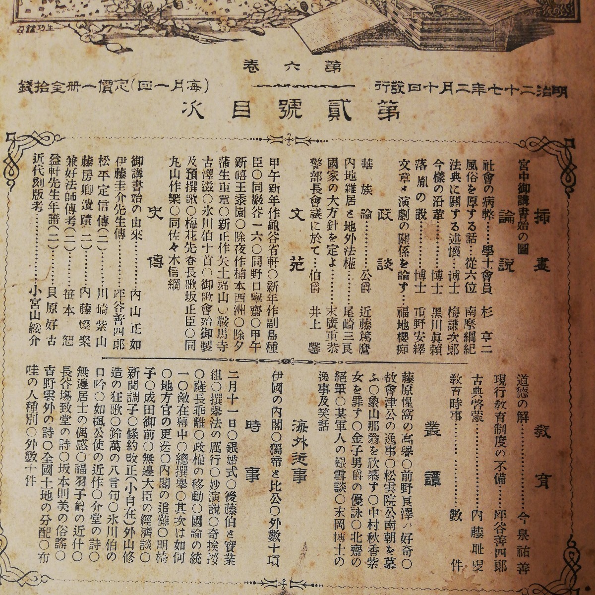 - 明治27年 日本大家論集 第六感 第2号 風俗を厚する話 華族論、ご講書始の由来、花 321