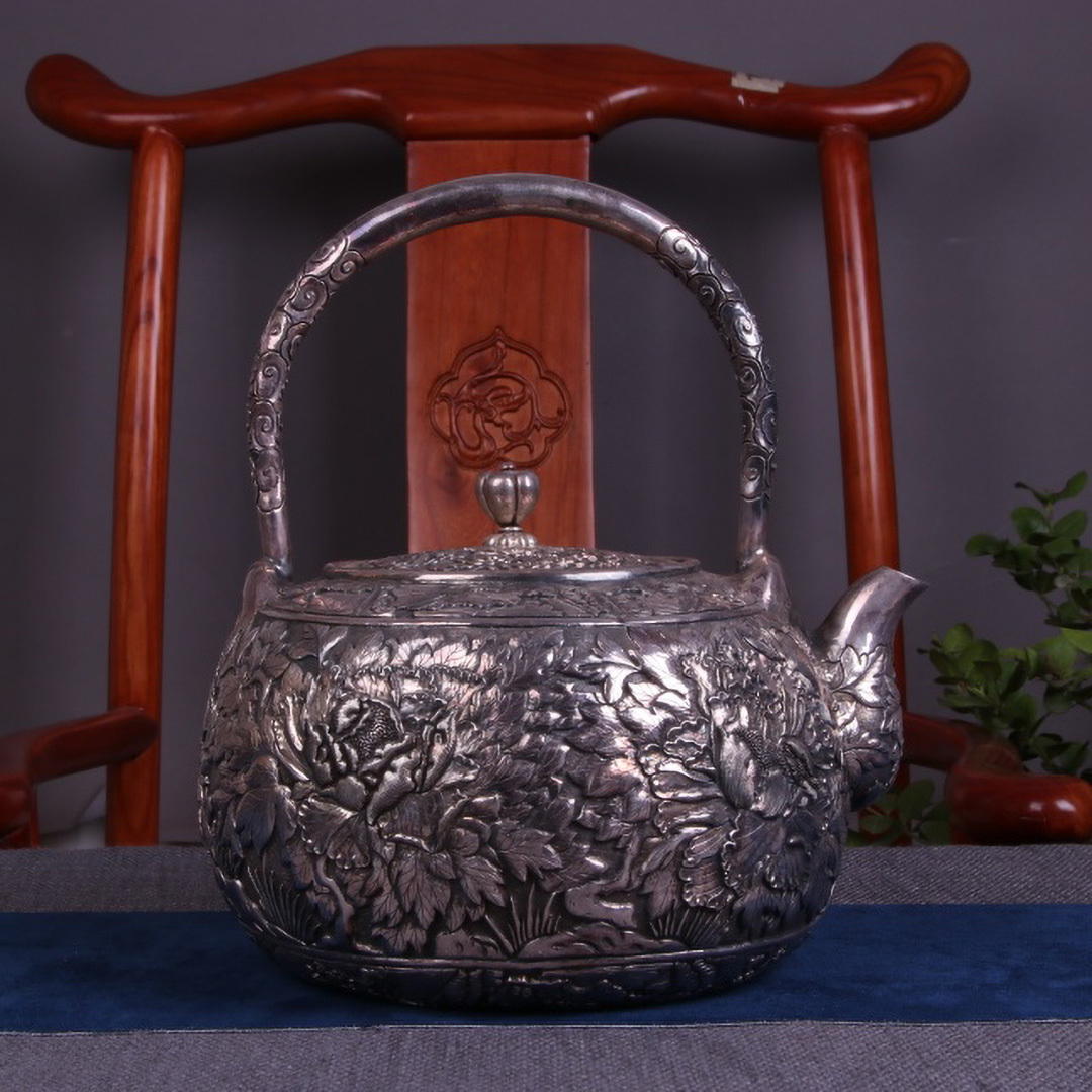 - 古銀 茶壺 「純銀鏨刻牡丹紋口打出巨大提梁壺」 銀瓶 煎茶 湯沸 急須 茶道具 南鐐 金工 茶器 時代物 LT-09095