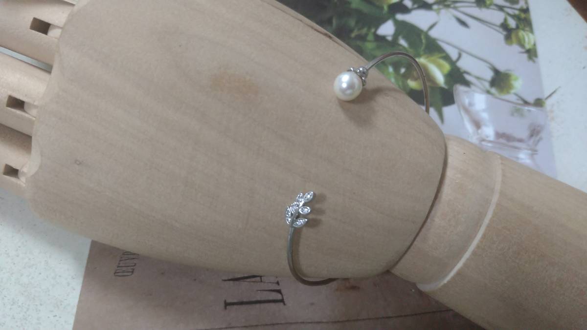 - 1粒パールビジュー×ラインストーン・リーフモチーフ シルバーカラー 細ブレスレット