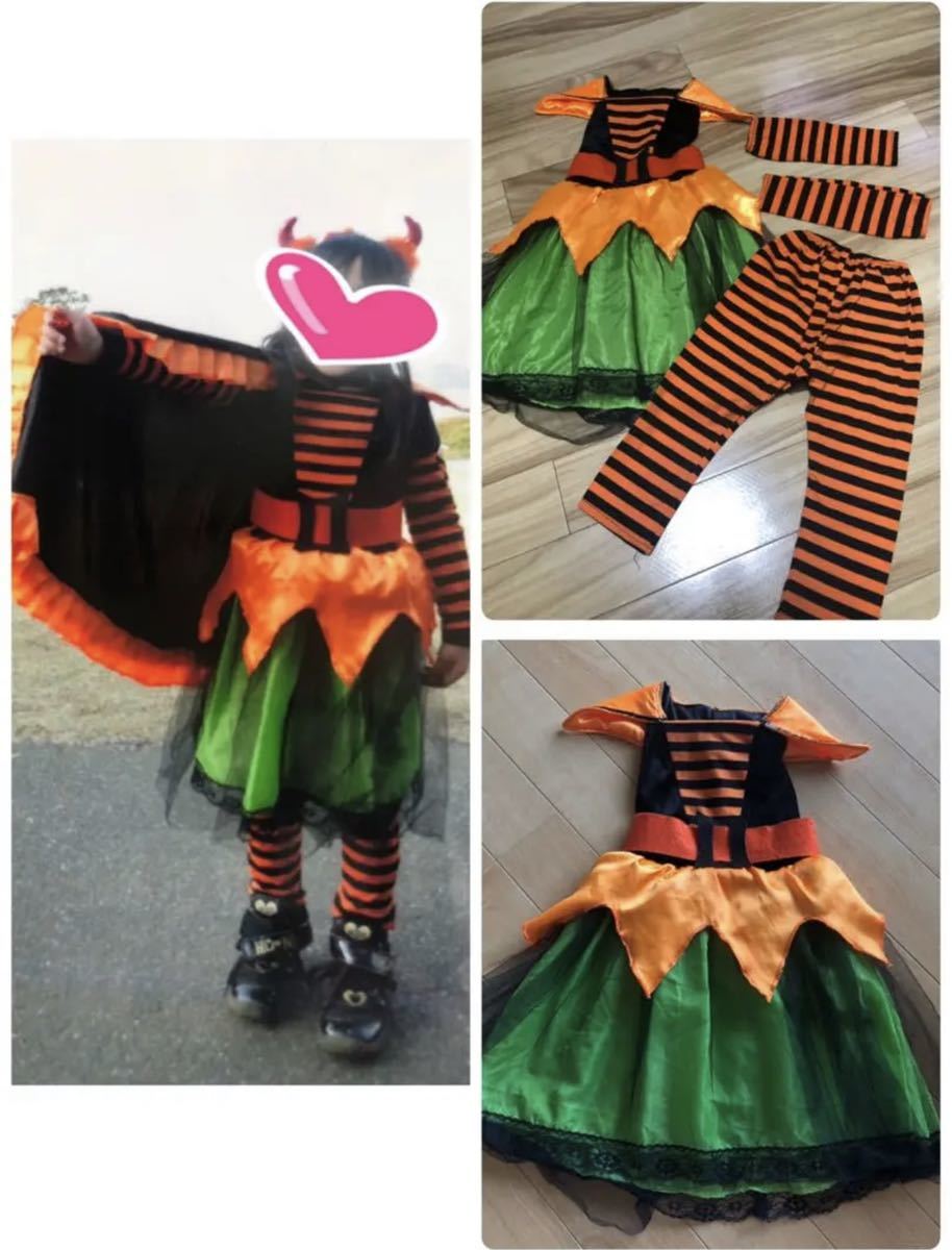 > 一度着用ハロウィン魔女コスプレ120 アームウォーマーレギンスドレスワンピ3点 幼稚園保育園 小学生 女児 子供服 キッズ