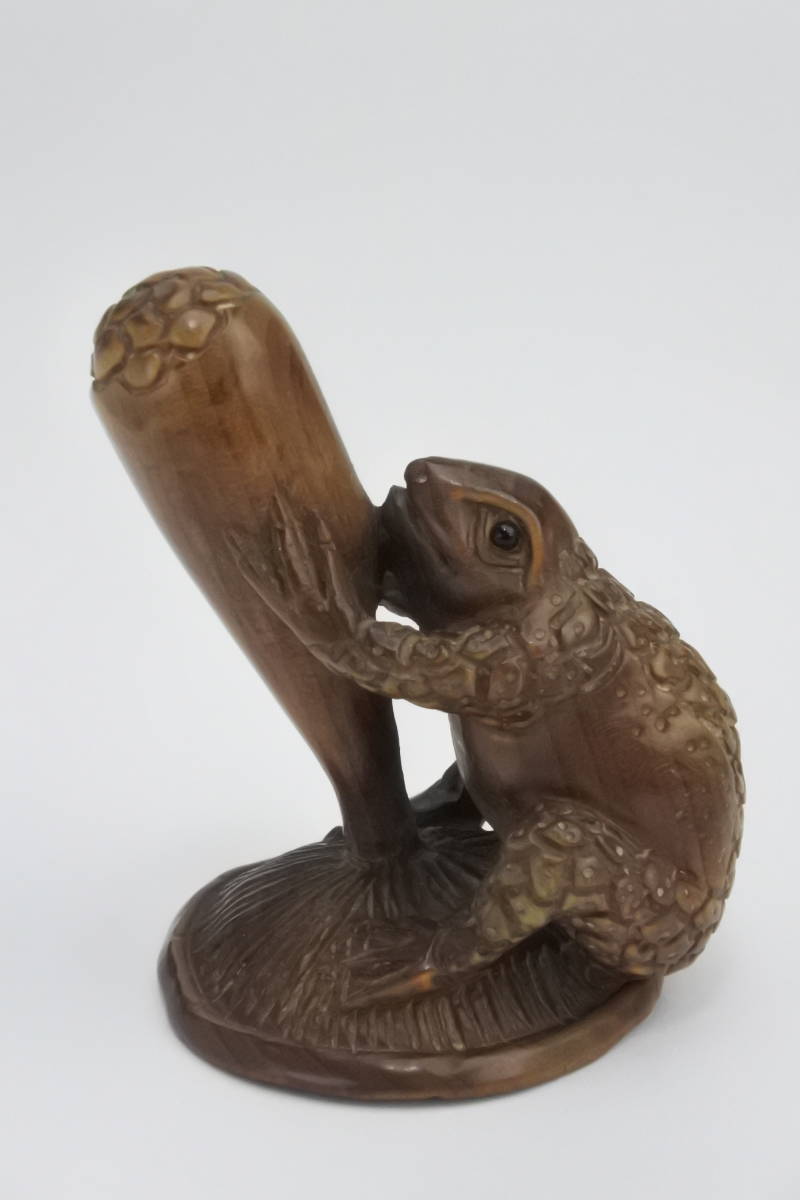 - 古物 根付 蛙 名入 木 彫*