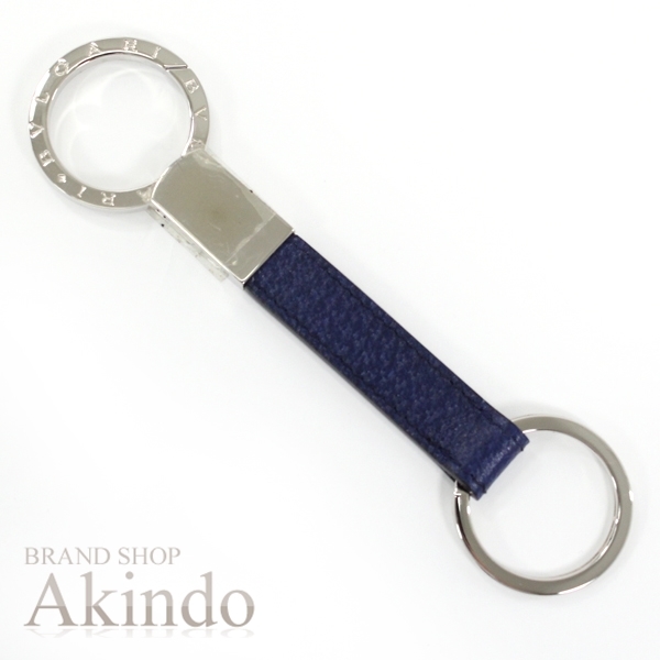 - 【未使用】ブルガリ Wキーリング ブルガリブルガリ ロゴ刻印 ダブル レザー キーホルダー リング シルバーxネイビー