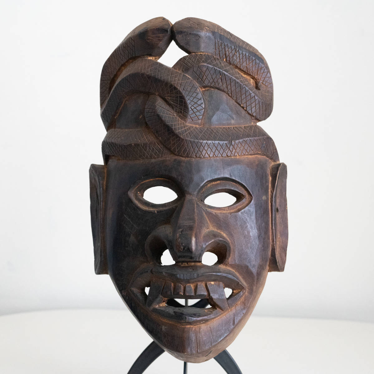 - 木製仮面 全長39cm 民族 木製彫刻 木面 置物 オブジェ 飾り 古道具 民芸 お面 アンティーク へび 蛇 アフリカ?