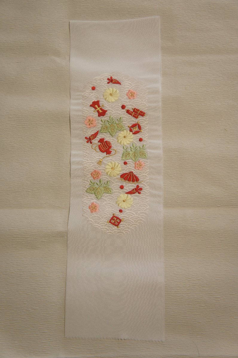 - 新品『和装庵』白色地刺繍青海波宝尽し紋化繊半衿[E14652]