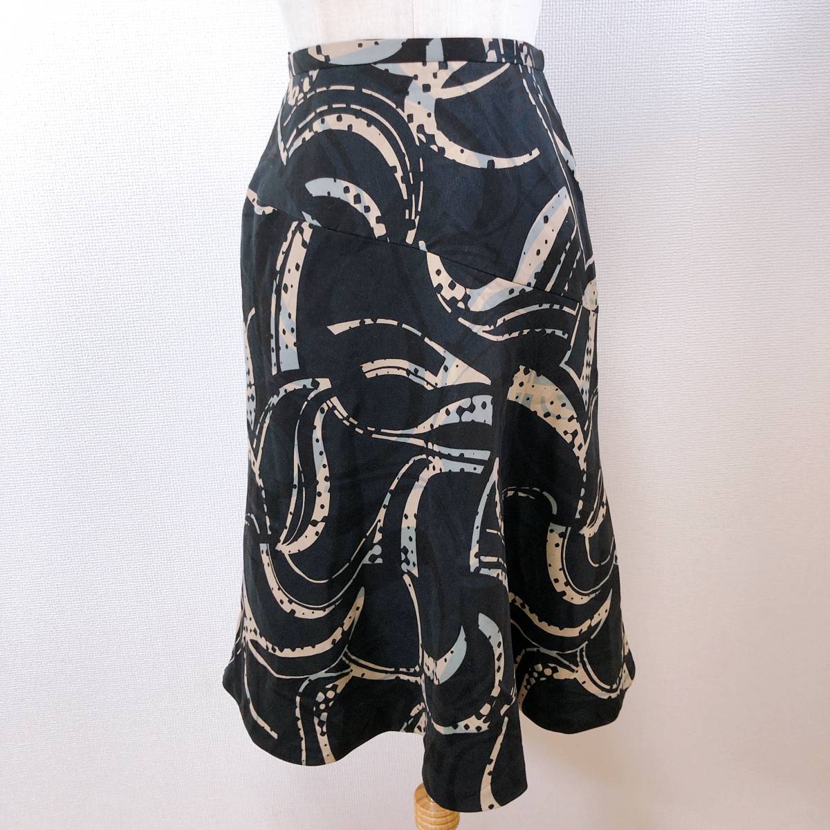 > WS0370 美品 P.B.S レディース フレアスカート 日本製 美しい 9号(M) ブラック(黒) 幾何学 ポリエステル 平成 昭和レトロ エレガント