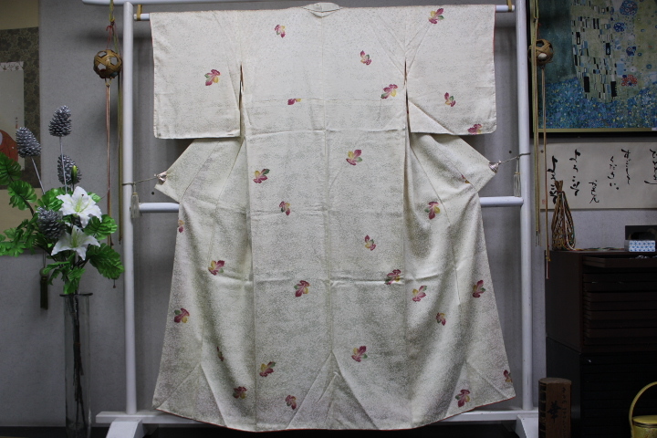 - きもの今昔6050 小紋のきもの 広衿袷仕立 正絹綸子地クリーム色木枯らしに紅葉落ち葉 袖はシツケ付き 身丈156cm