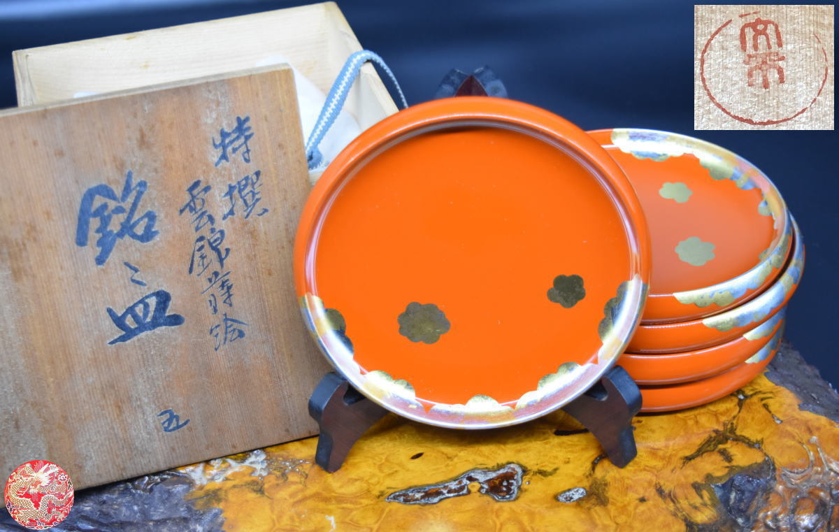 > 【送料無料】文平 特選 雲錦蒔絵 銘々皿 五枚組 時代物 年代保証 茶道具 漆器 美品 稀少 (旧家蔵出し) WWWT007
