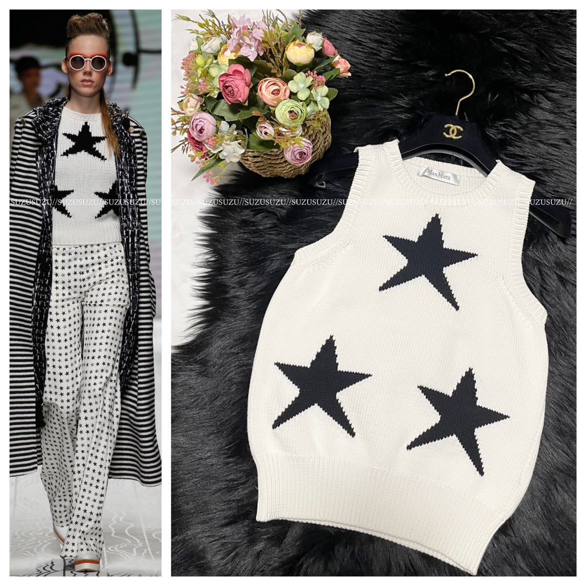 - 本物 コレクションモデル マックスマーラ 最高級ライン 白タグ スターデザイン ノースリーブ ニット ベスト セーター M 白系×黒 Max Mara