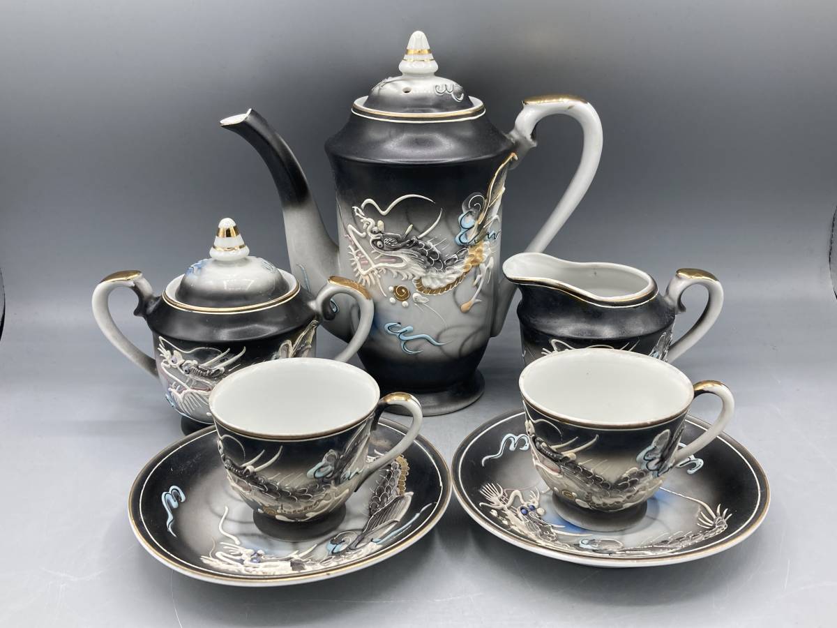 > 里帰り オールドニッポン 2人用 3D 盛上 透かし絵 芸者 龍 ドラゴン コーヒーポット シュガーポット クリーマー カップ ソーサー (8)