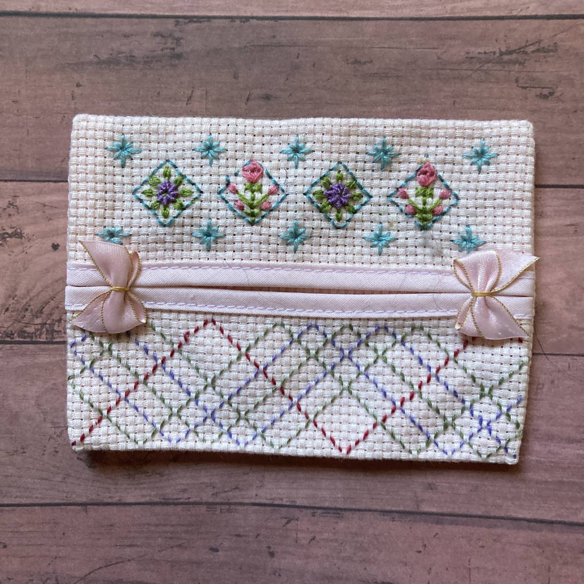 - ポケットティッシュカバー ハンドメイド 刺入り スェーデン刺繍入り 手作り品 薄いピンク