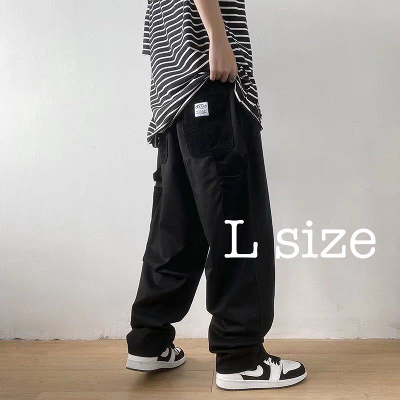 - ワイドパンツ ボトムス コーデュロイ ストレートパンツ ユニセックス 男女兼用 ブラック 黒 L