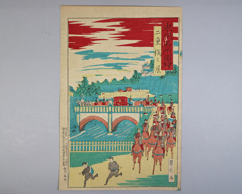 > 111) 1枚 豊舟画 浮世絵 錦絵 木版画「東京名所図絵 二重橋之景」長谷川寿美 明治30年 明治時代 「真作」<開化絵 皇居