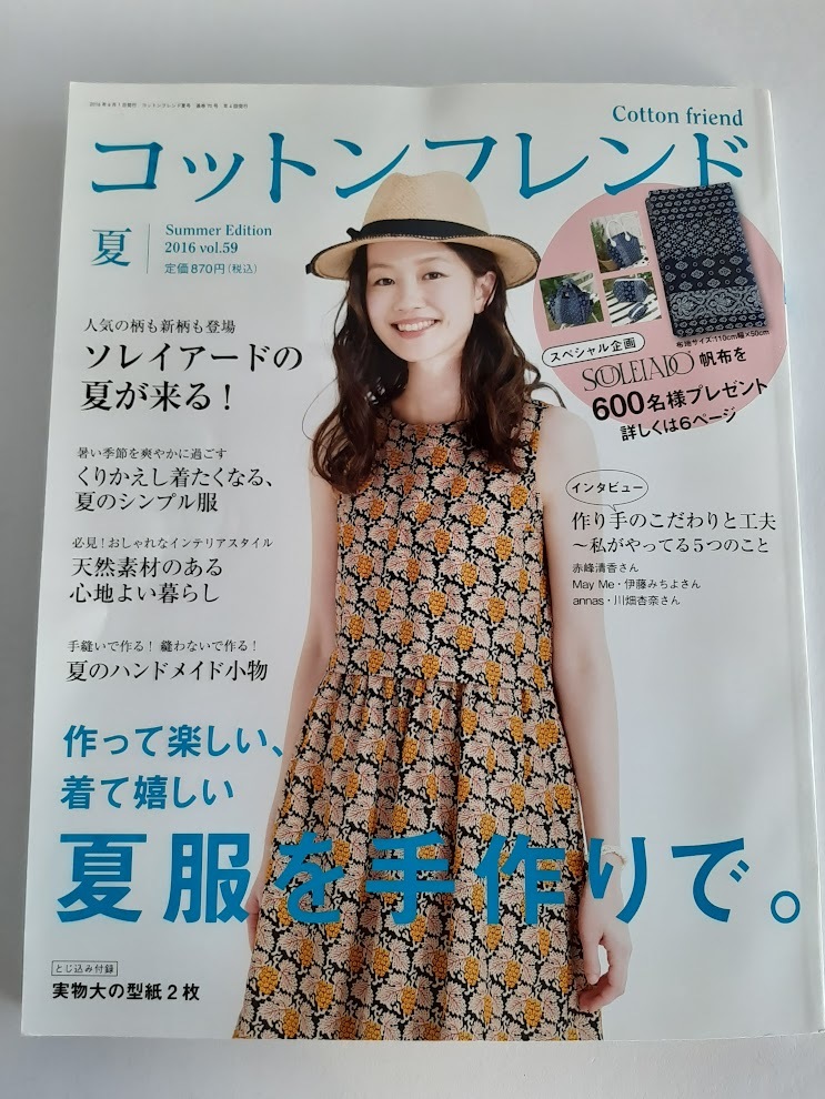 - ★送料込【コットンフレンド2016年夏号(6月号vol.59)】ソレイアードのウエア&小物/夏のシンプル服★実物大の型紙2枚【ブティック社】