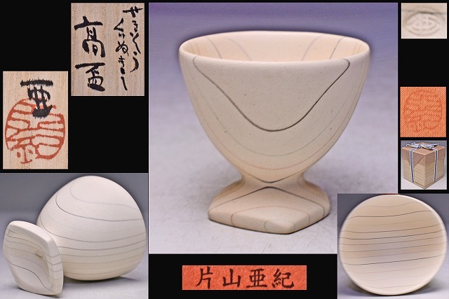 > 片山亜紀 ★ せきそう くりぬき 高盃 ★ 共箱 共布 栞 ★ 積層刳貫手 ★ 独自の技法で 年輪のような模様 ★ ぐい呑 ★ 酒器 ★ 酒盃 ★